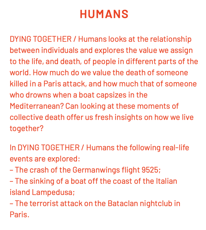 I attended DYING TOGETHER / Humans in 2018. It was an interesting experience. As Lotte mentions in the video above, the audience performs with the performers. What stood out to me was the method used to create this performance.