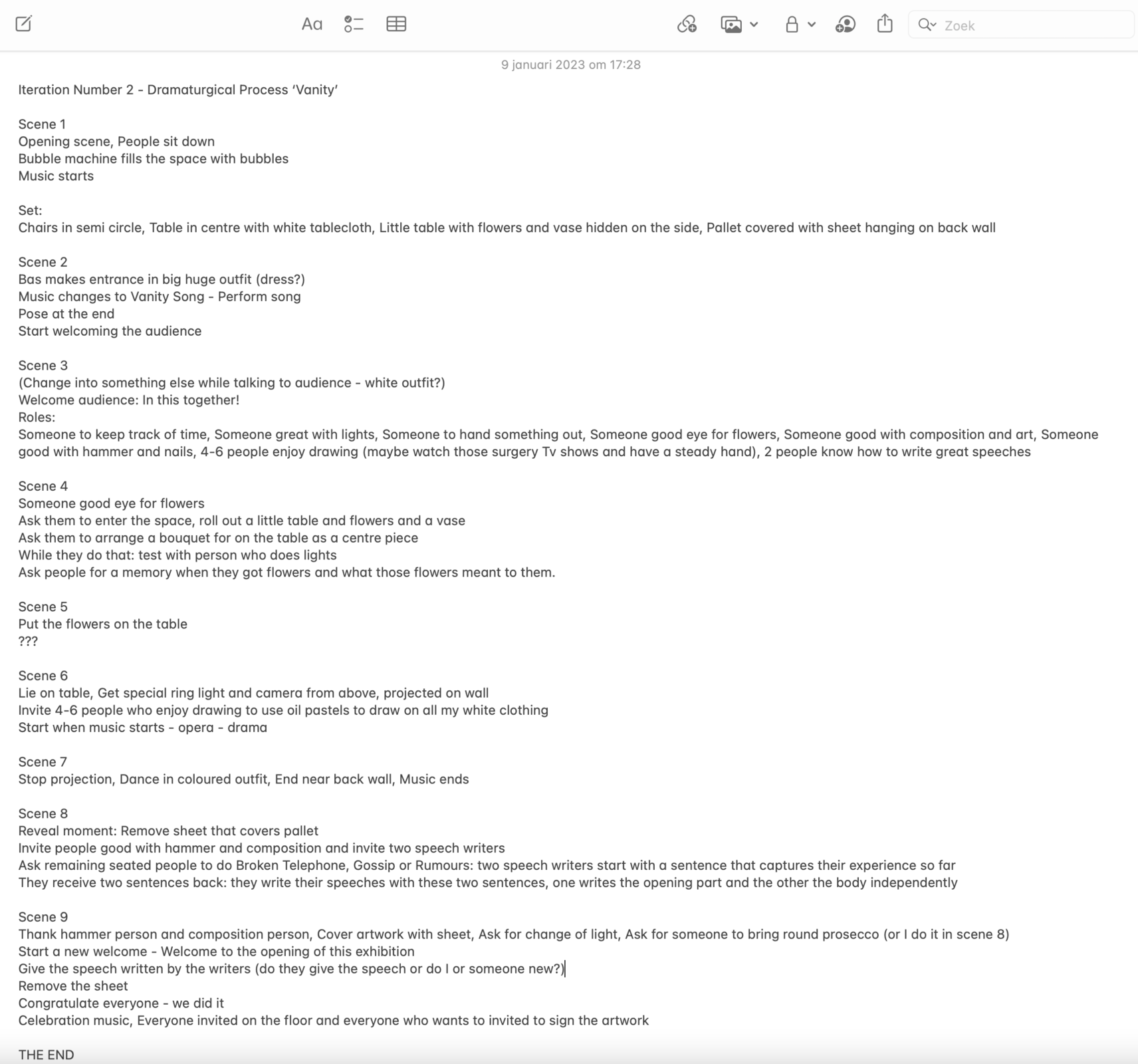 With the goal and aims in mind I create a dramaturgical structure that supports these objectives. Since I am creating a participatory experience and I concerning myself with devising a process. That process consists out of dramaturgical pilars to create an experience that has a beginning and an end. The theme influences the dramaturgical pilars that make up the structure. Vanity as a theme helps choose what the dramaturgical pilars will be. At the same time there is space within the structure for things that arise out of participation. There is a balance between rigidity and flexibility.