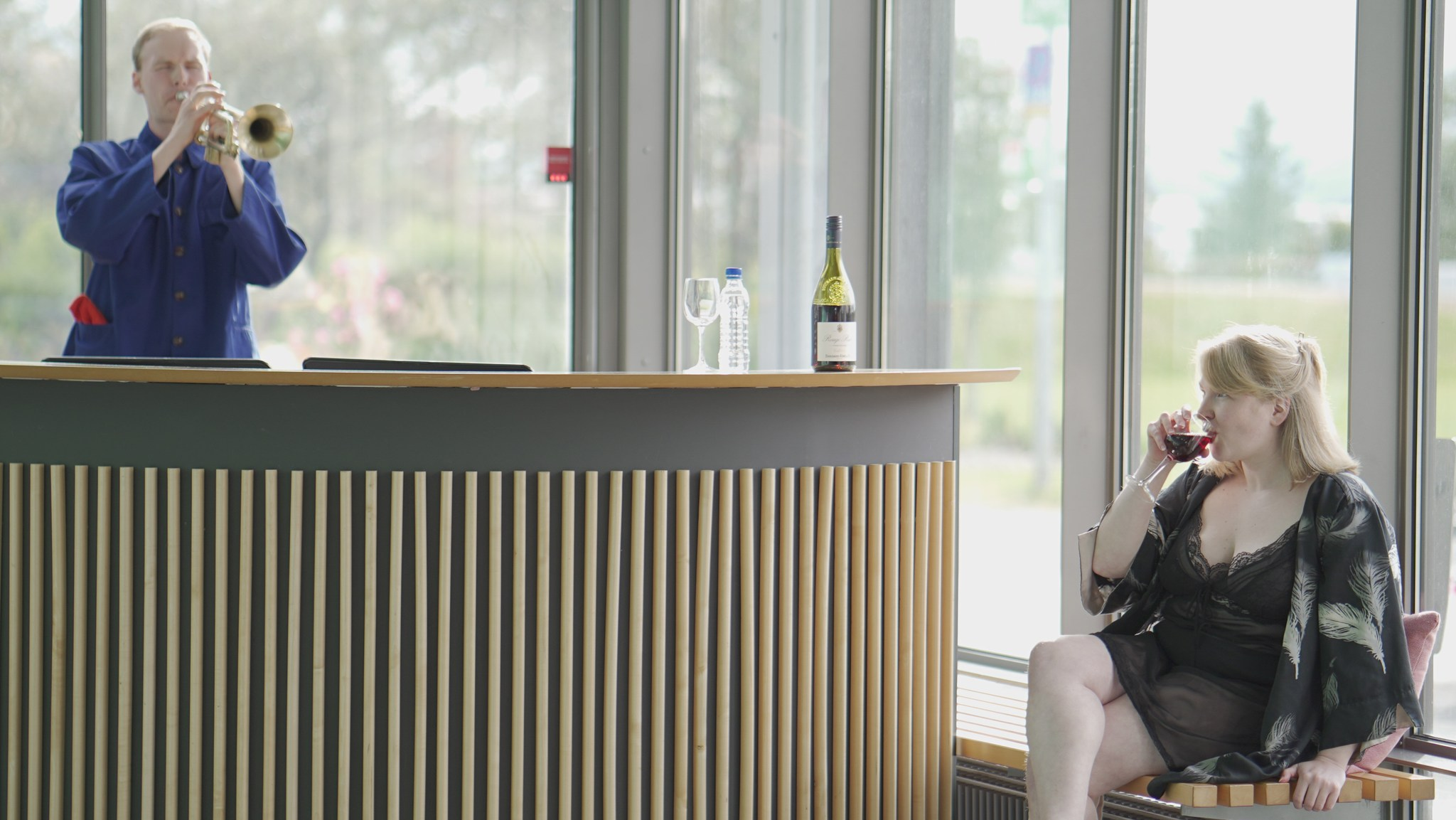 As the text goes on, the heroine has given up on the idea that these values are of a true meaning to her. To define the inconsistency, we had her apply nail polish on her toenails while saying “Trivial things are not for me”. To my great pleasure, the audience responded to this moment with laughter.