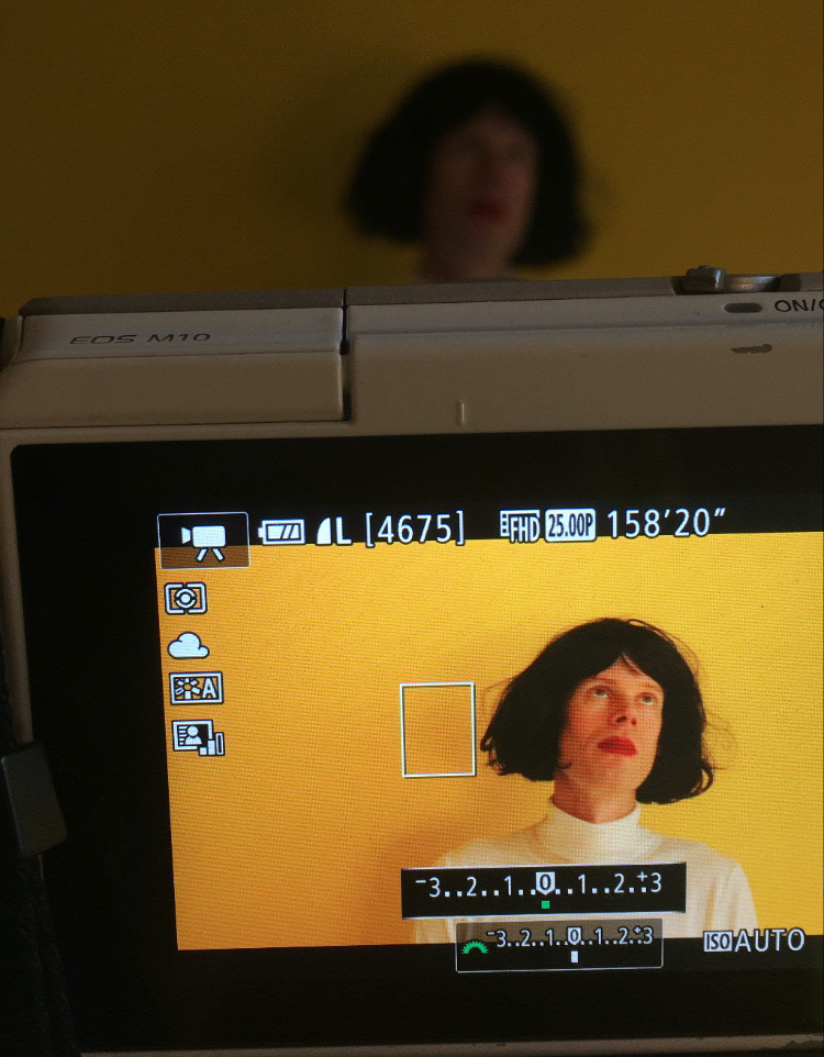 The only thing she asked me to do as preparation was to shave off my beard and to learn the lyrics for Rod Stewart’s ‘I am Sailing’. When I got there, Marcela had a couple of wigs and some clothes that matched. She put a suitable make-up on me, then placed me in front of this very yellow wall and put a camera about 1.5 metres from me. A Zoom sound recorder was right next to me out of the picture frame.