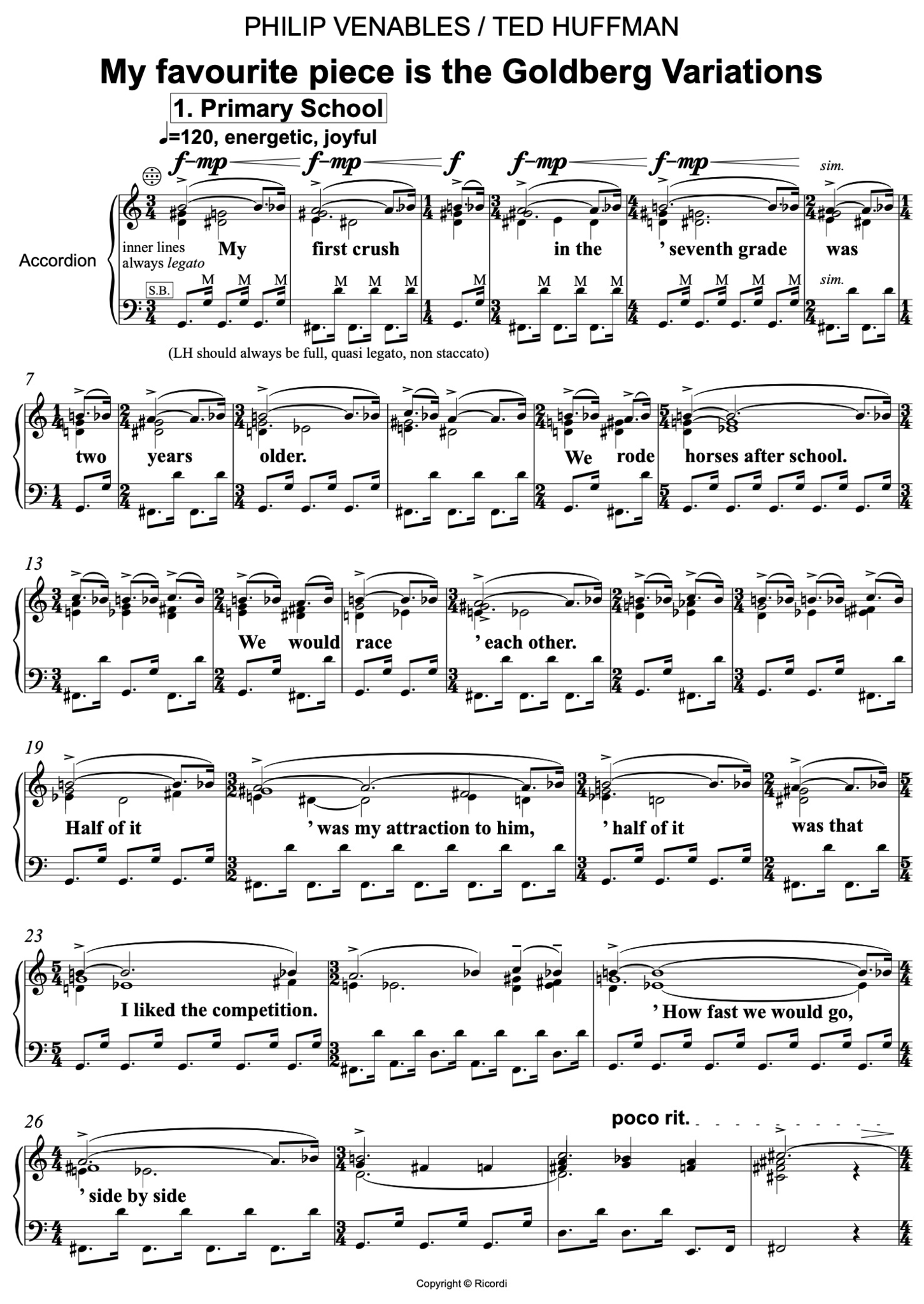 The first difficulty when beginning to learn My favourite piece is the Goldberg Variations (My favourite piecein short) was that of multitasking: how to play the accordion and speak text at the same time. Or more specifically, how to play the accordion in particular tempi, rhythms and dynamics and speak text freely on top of it at the same time. Whereas the music is precisely notated with every note rhythmically positioned in conventional bars throughout the score, the distribution of words is more loosely indicated by placing the first words of sentences approximately on or slightly after certain beats. Ideally, the flow and timing of the voice should be completely detached from that of the accordion, which is different from the way voice and instrument often merge in the self-accompanied singing typical of other musical genres.
