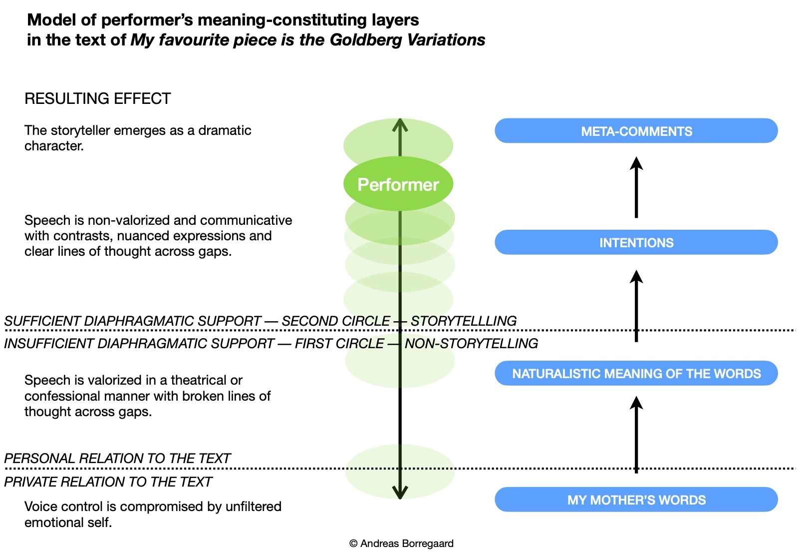 Reflecting on the process outlined above I have tried to transfer the described practical work into a theoretical model that clarifies the meaning-constituting layers in the text and how my relationship with them shapes the performance.