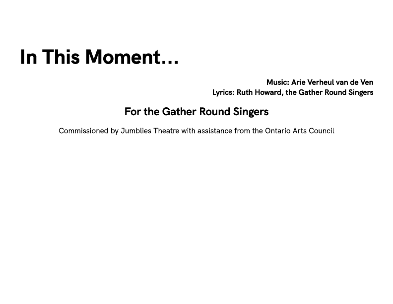 In This Moment was a multi-year project spanning multiple media that was centered around a musical collaboration with the Gather Round Singers, taking place online through the COVID-19 lockdowns in Toronto between 2020 and 2022. The Gather Round Singers are a radically inclusive community choir that are a part of JumbliesTheatre. What this means is that anyone can join the choir at any time, regardless of age, ability, experience, or number of rehearsals before the performance.
