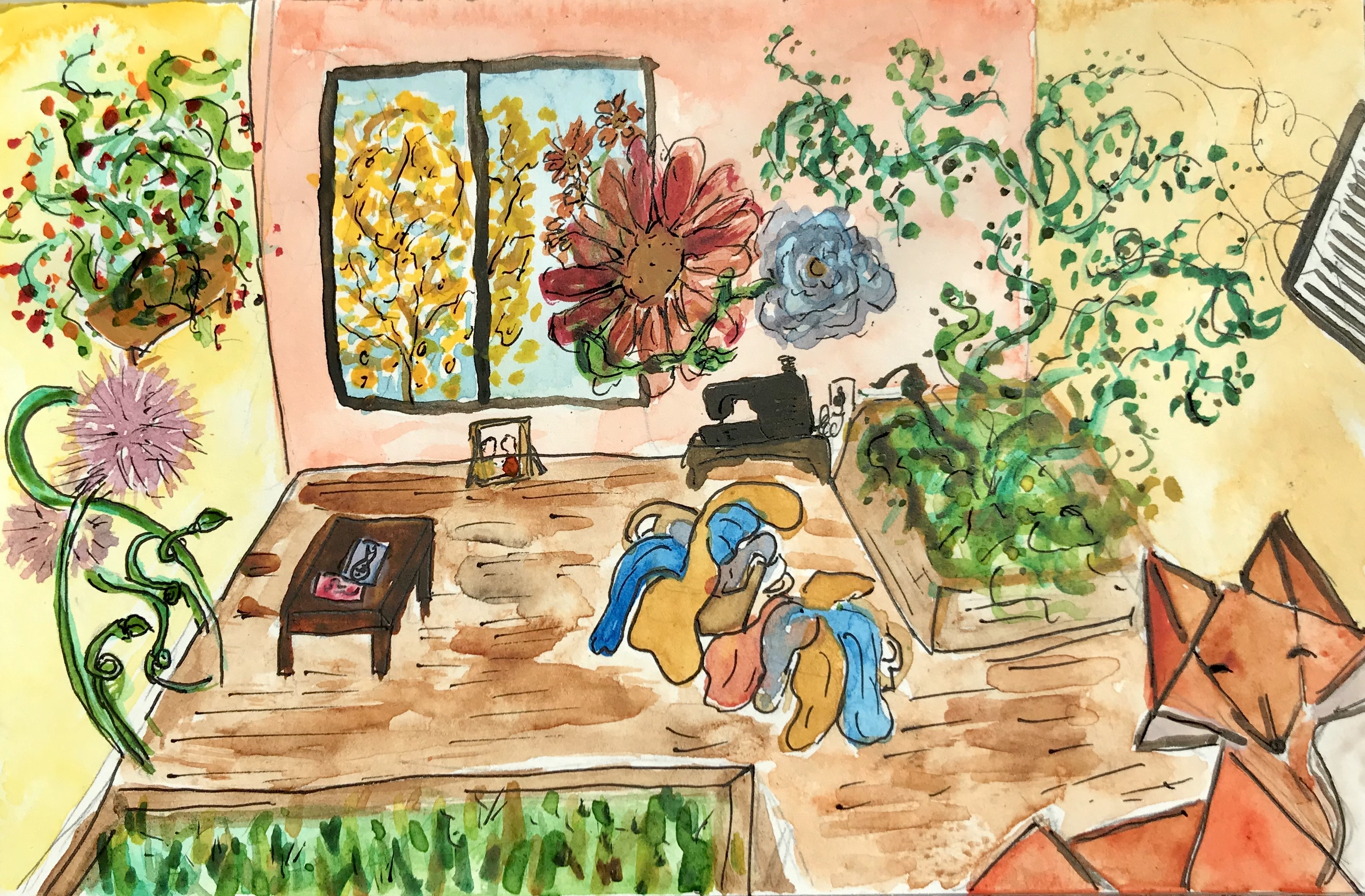 An image showing the observations from a Zoom breakout room, and the resulting art of the imagined physical space (Painting by Sam Rowlandson-O'Hara)