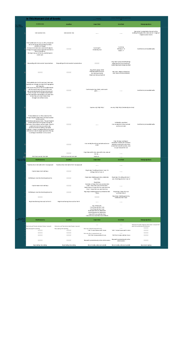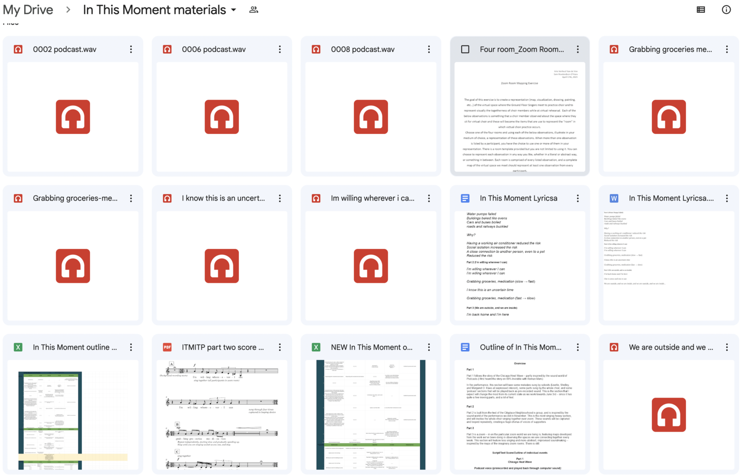 Included in this folder are material for learning the various musical lines in the piece: lyric sheets, notation for those who read it, and audio recordings for those who learn by ear. There are also a number of outlines, and a document explaining the Imaginary Zoom Room workshop. This drive folder was our main 'document' for holding and explaining the piece in a way that all choir staff could quickly understand, and was made for the first iteration of the piece which was performed entirely on Zoom (with the choir and audience on the same call). This folder remained the main 'score' of In This Moment through the following hybrid performances as well.