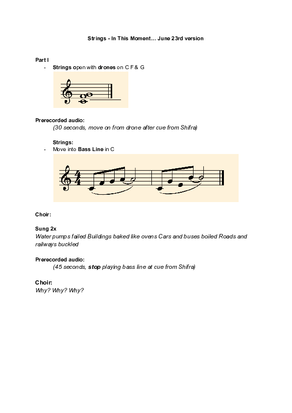 The final iteration of In This Moment came together when lockdown restrictions in Toronto lifted enough that we could return to singing in person as a full group in May of 2022. On a whim, Shifra and I improvised an 'in person' version of the music we had been singing on Zoom for the previous two years. This ended up working very well, and gave us an opportunity to explore new ways of singing the music we had become so familiar with - as a sort of farewell to the strangeness of online music making we had become accustom to. Joining the choir as an accompanist was fiddler Áine Schryer-O'Gorman. We both accompanied the choir as a violin/viola duo. The final document we used was a short guide for accompaniment, with small pieces of notation when needed, but mostly just via text, to help guide our memory.
