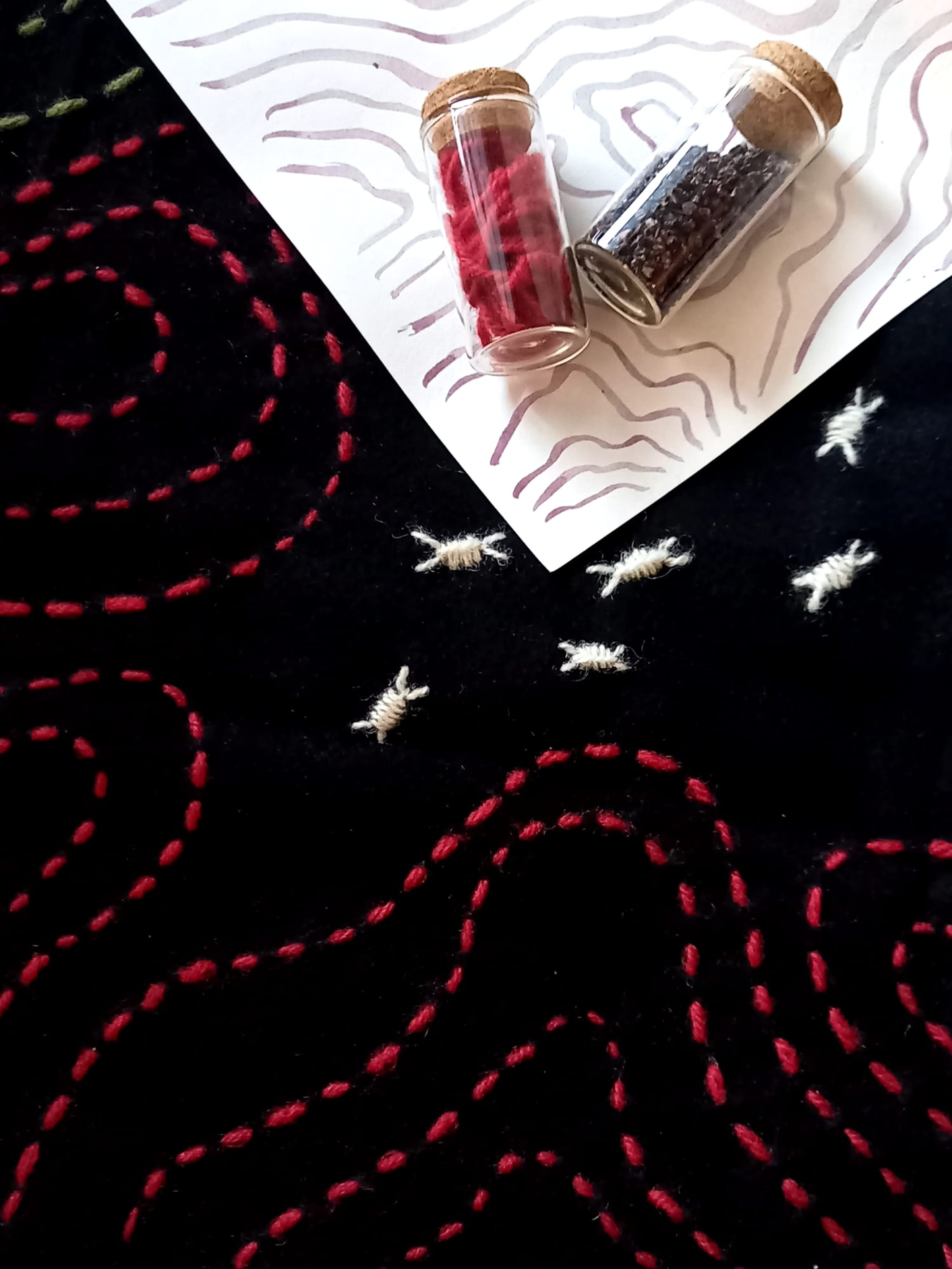 Fig. 2 Cervantes´s first piece for the Embroidered Stances project, the picture depicts a close-up of the embroidered insects next to glass bottles containing dried cochineal insects and dyed yarn. Photographed by Cervantes, 2023.