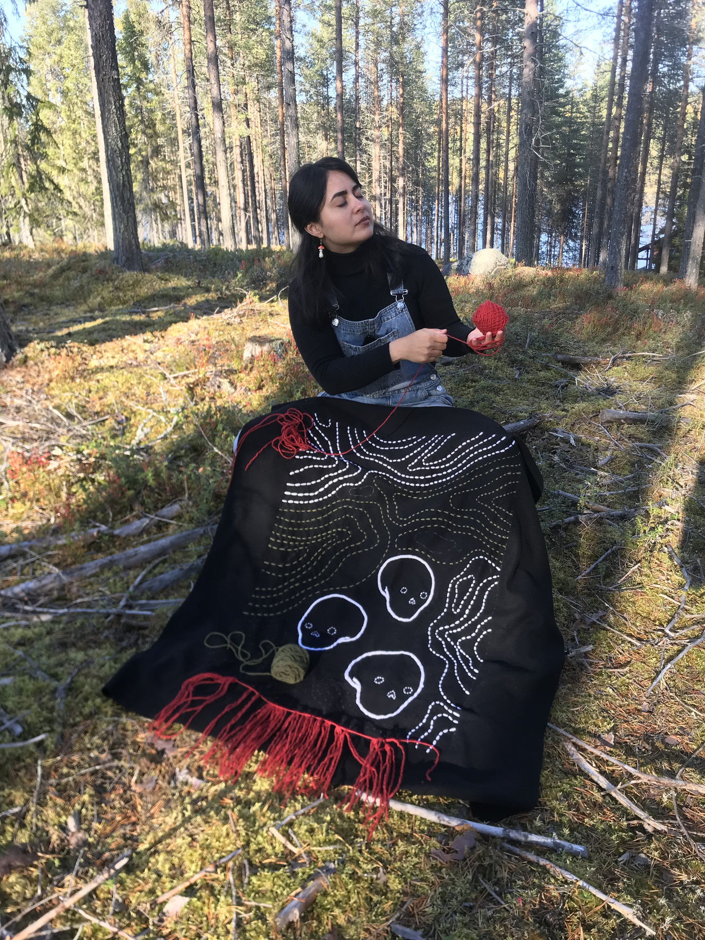 Fig. 1 First author Cervantes at one of the Embroidered Stances session at Huhmarniemi´s cottage during the summer of 2022. Photographed by Huhmarniemi, 2022.