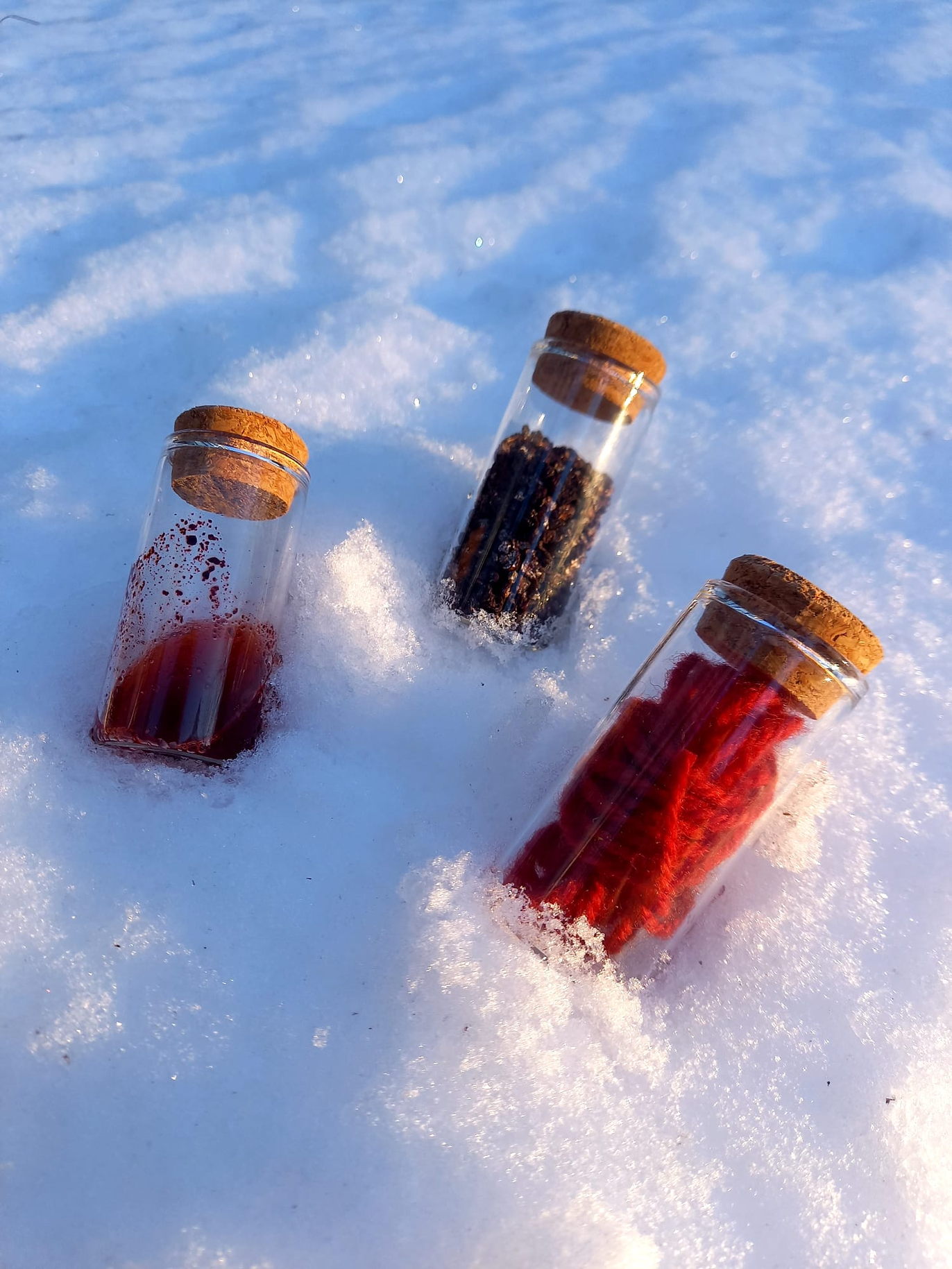 Fig. 7 Bottles of glass containing dried cochineal insects, a mixture of vinegar and cochineal powder and dyed yarn