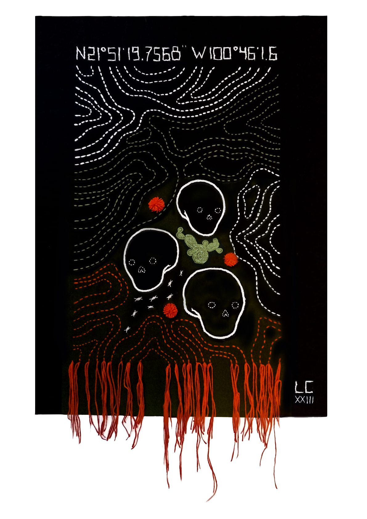 With this piece, I seek to interpret the mixed feelings towards my own culture, first by celebrating the natural death as something inevitable like life itself, an endless cycle of symbiotic duality. At the same time, through the representation of embroidered skulls, topographical lines of the region where I was born, and spots of red yarn coloured with cochineal insect endemic from Mexico, I wanted to present a tribute to the cochineal insect, falling from the cactus, to become the red colour. With this piece I want to condemn the centuries of invasions, oppression, colonialism, violence and tragedy that have bled us as a culture, causing collective suffering for centuries. - Cervantes research diary.