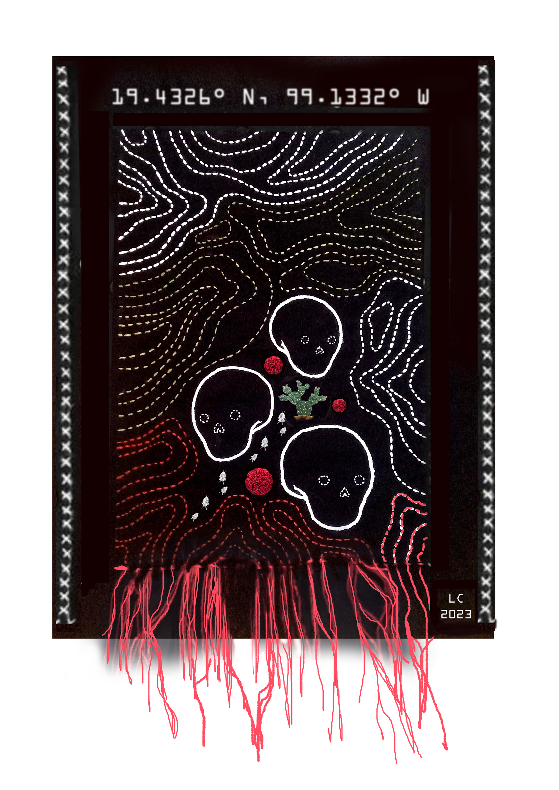 With this piece I seek to interpret the mixed feelings towards my own culture, first by celebrating the natural death as something inevitable like life itself, an endless cycle of symbiotic duality. And at the same time, through the representation of embroidered skulls, topographical lines of the region where I was born, and spots of red yarn colored with cochineal insect endemic from Mexico, I wish to condemn, the violent and tragic death that bleeds us as a culture, generating collective suffering.