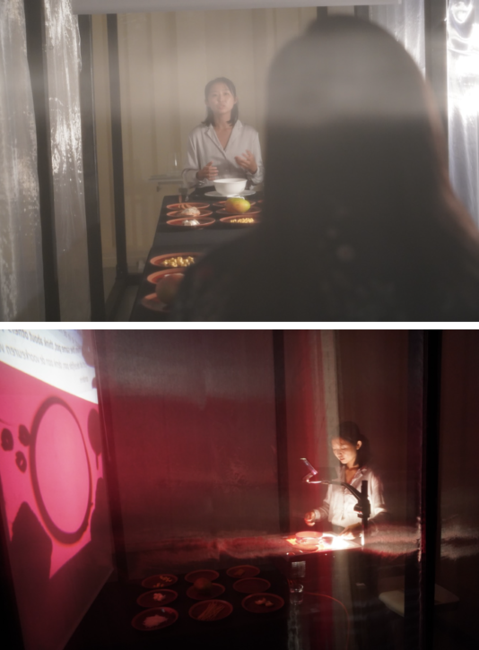 I = YOU - A ONE-ON-ONE STORYTELLING PERFORMANCE took place around a long dining table. Nine plates of food/ingredients were displayed on two sides of the table. Behind each food there is my personal story as a non-local living in Europe, and we (the audience and I) use these stories and/or food to share our perosnal memories or experiences.
