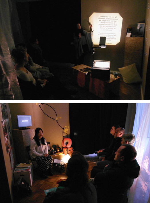 Each storyteller decided how to "design their stage" themselves, from what kind of images that would like to put on the wall to what objects they would like to use to support their storytelling. My role is more like a coach to provide feedbacks when they were developing the design of the space, I was also like a practitioner to provide solutions for practical matters.