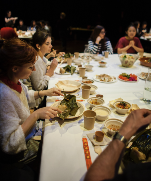 People eat together in this project. The dining event plays a role in bringing people together to have conversation. In the tasting event, people interacted with us on the street. In the food stoll event, people talked to us as they needed to order what food they wouldl ike to eat, but also people stayed around the stoll while eating their food, they chatted with each other. The third dinner event, the guests were interacting with each other. Their sharing is beyond the food itself.