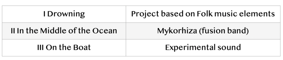 In Mindset & Graphics, I have shown that I divided my mindset into three different periods. As I mentioned, my music and how I play pipa in the musical context strongly relate to those three periods. Therefore, in this part, I will divide my projects into three periods: Project based on Folk music elements, Mykorhiza(Fusion band), and Experimental Sounds.