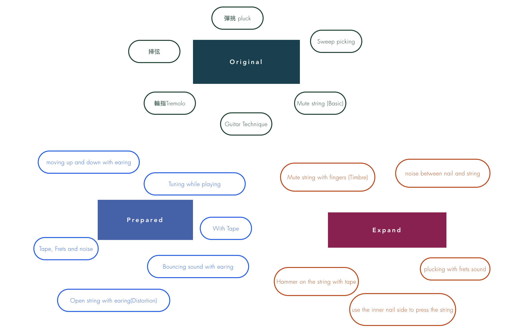 In one of the seminars, I had the chance to read about Magda Maya’s research, Creating with Timbre (2019), where she documents all the sounds she found in/on the piano. Later, she creates a vast sound map to present her research. As a pipa player, I thought that the unique sound of pipa was already adequate until I saw Magda’s mind map. Then, I started to think about creating new sounds from the perspective of pipa player. How can I utilize the maximum of both instruments and my fingers? How can I expand the sounds which still based on traditional aesthetics?