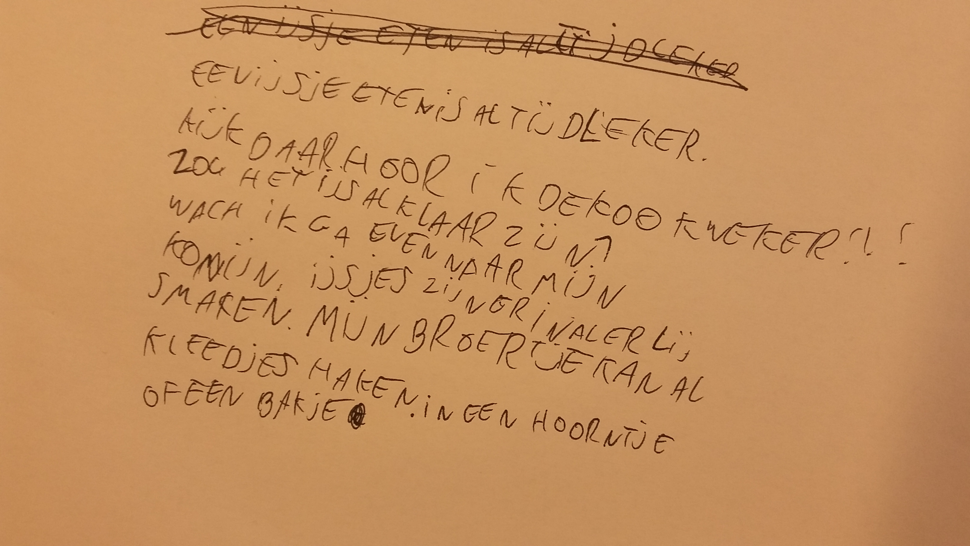 Heidi: ja dat is wel mooi want die vrijheid doet ook iets anders. Ik gaf eerder al aan dat ik soms een behoorlijke anarchie in de klas toesta. Dat is niet per se omdat ik vind dat alle kinderen helemaal losmoeten maar wat voor mij heel erg van belang is is dat ik de leerling vanaf het eerste moment het vertrouwen geef dat ze het kunnen: iedereen kan dichten en jullie ook en dat gaan we nu doen. En het is geen trucje! Het is ook echt zo; ik weet zeker dat ze het allemaal kunnen en dat is ook zo. De enige keer dat een kind in mijn les een leeg blad inleverde was een meisje van acht die haar gedicht niets noemde.