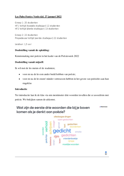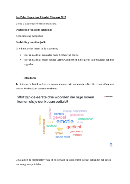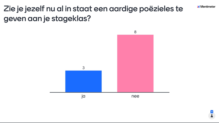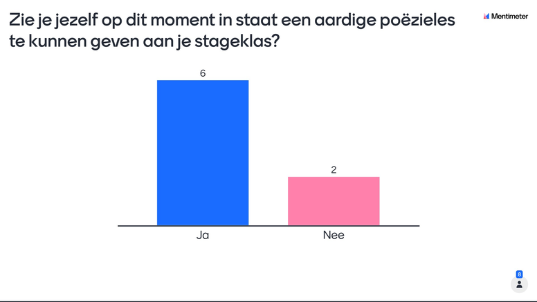 Ondanks het feit dat het een kleine klas was en dat de les i.v.m. corona online moest plaats vinden, heb ik de groep kunnen laten kennismaken met poëzie en met de mogelijkheden rondom poëzie in de klas. Het feit dat ze na kennis te hebben gemaakt anders aankijken tegen hun eigen mogelijkheden om poëzie te gebruiken in de klas, is van belang voor dit onderzoek.