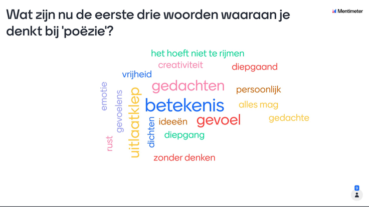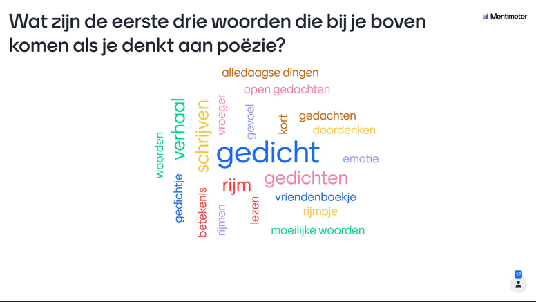 • Dat de studenten een wat diepere betekenis geven aan poëzie na de les dan voor de les. De eerste associatiewoorden zijn heel oppervlakkig, terwijl de associatiewoorden in de meting na de les specifieker zijn.