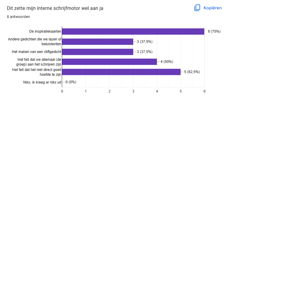 Vervolgens vraag ik hen wat ze nodig hebben om ter plekke hun gedicht te kunnen afmaken. Hierbij geef ik aan is het niet van belang dat het in eens keer een heel goed gedicht is maar dat het om een eerste versie gaat.