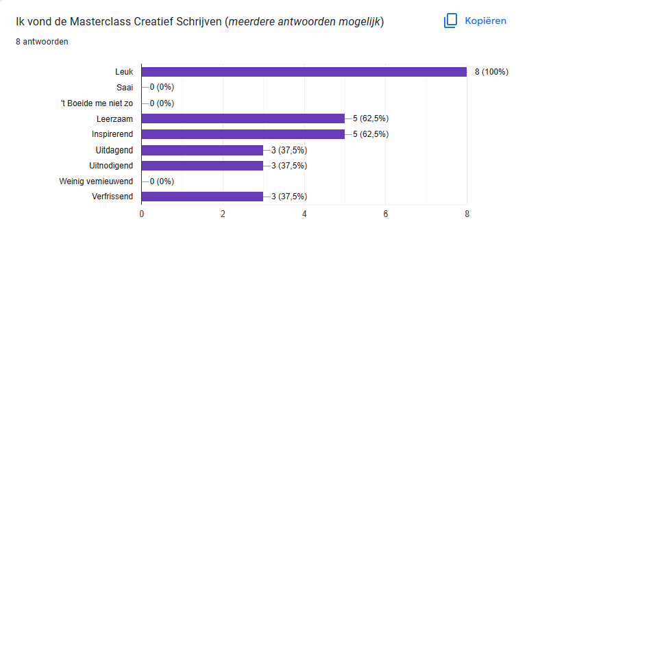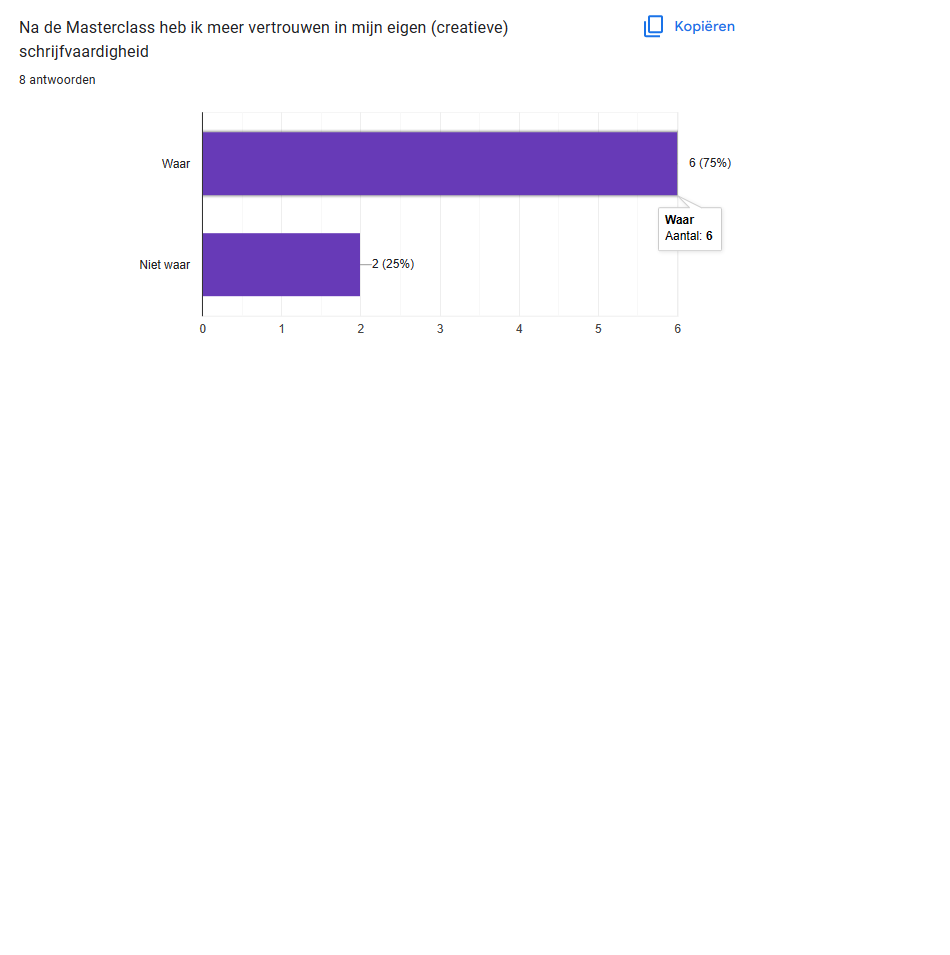 - 75% na de Masterclass meer vertrouwen heeft in de eigen creatieve schrijfvaardigheid