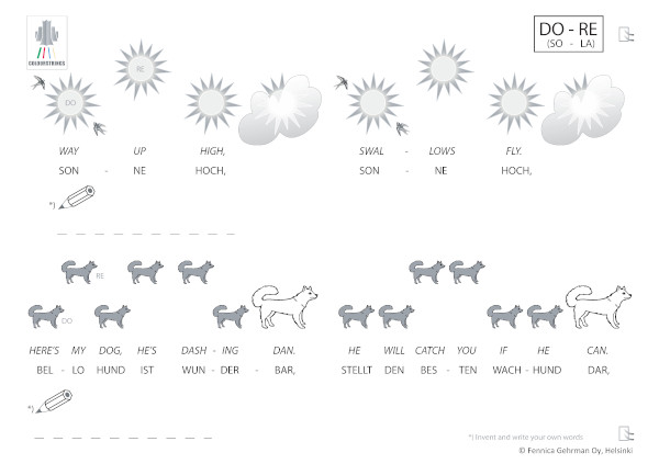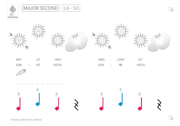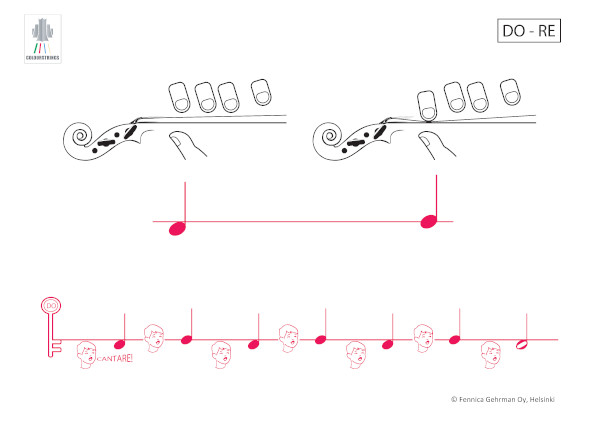 “To develop the skill of inner hearing, Colourstrings uses relative solmisation, a key feature, recurring on every level, and throughout all the method books. Connecting relative solmisation systematically with playing the instrument enables transposing and transforming the musical material, a regular strategy in the method to enhance also technical flexibility.