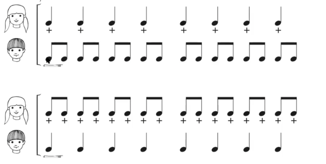There are exercises that involve playing while beating rhythm, that are written in two staffs. The child is asked to play right hand bow and left hand pizzicato. This method is used to introduce new rhythm figures and put them in relation to the beat.34.
