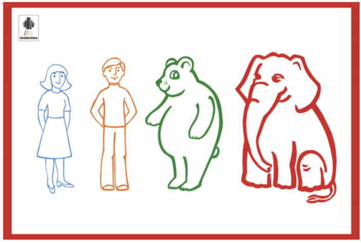 One very interesting feature of the Colourstrings method is the approach to the way notation is presented. Before introducing more complex notation, colours and pictures are used; this aims to create and keep a connection between seeing and hearing.