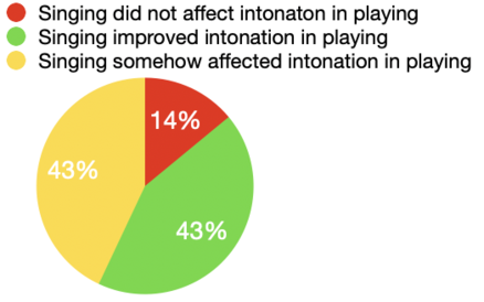 - 3 people out of 7 found that intonation in playing was positively affected by the singing after one week of practicing. 3 people found that intonation in playing did not automatically improve, but they became more aware of it in their playing. 1 person did not think singing had an impact on intonation in the playing.
