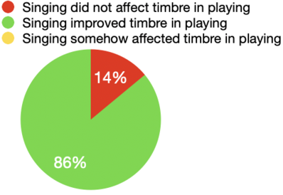 - 6 people out of 7 found that the timbre in playing was positively affected by the singing after one week of practicing. 1 person did not think that singing had an impact on timbre in the playing.