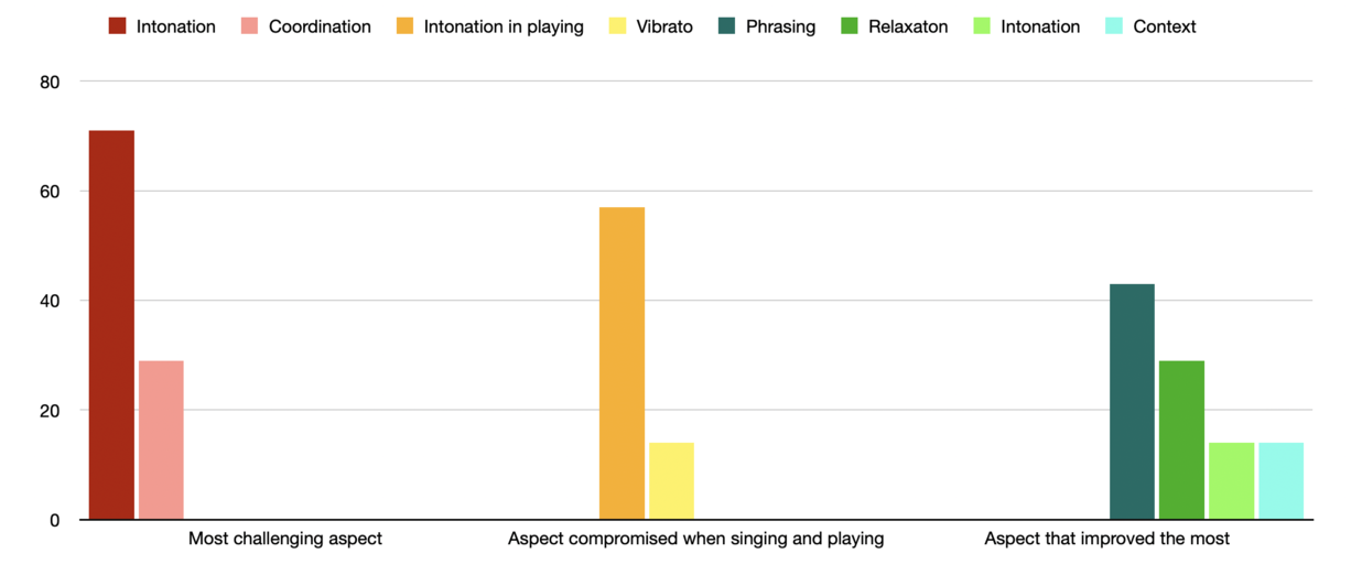 - 5 people out of 7 found that keeping the intonation of the singing and playing was the most challenging aspect. 2 people found that coordination was the most challenging aspect.