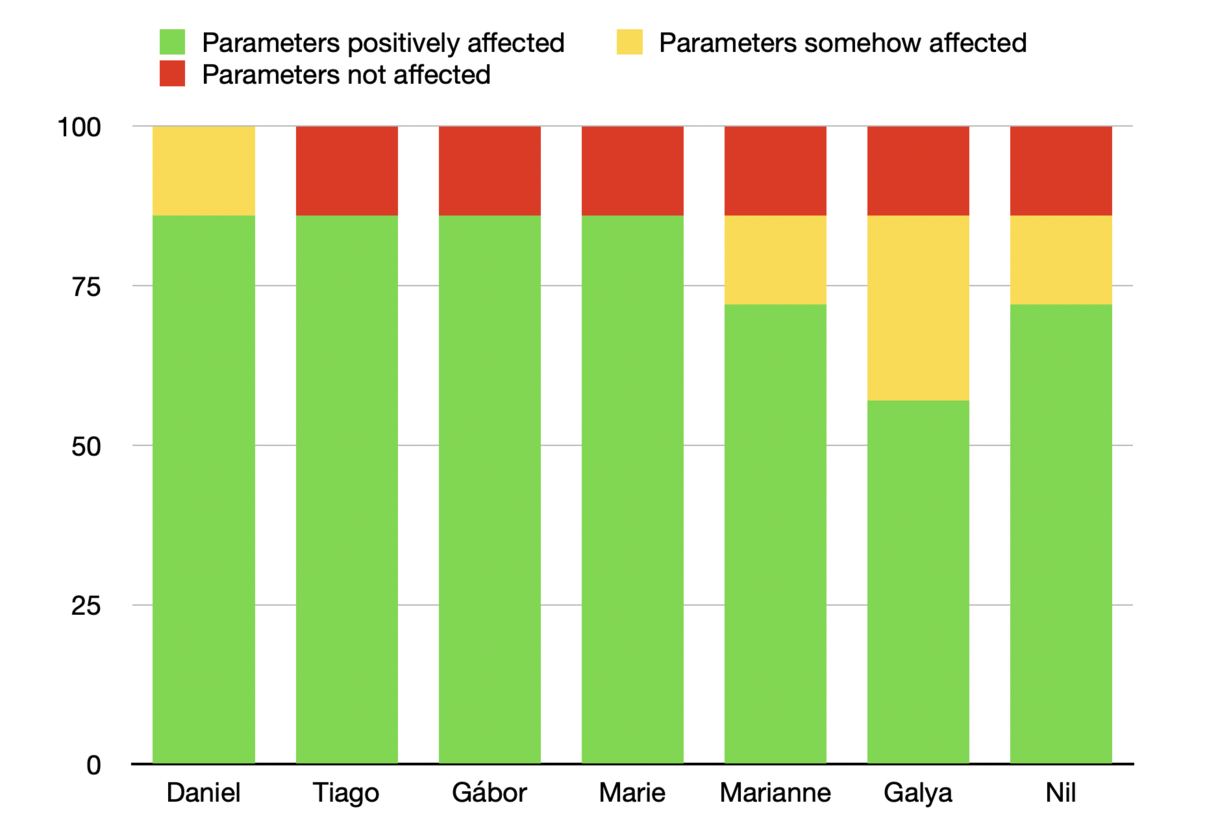 All of the participants' playing benefitted in most of the parameters analysed, with the lowest number of parameter positively affected per participant being 4 and the highest being 6 out of 7.