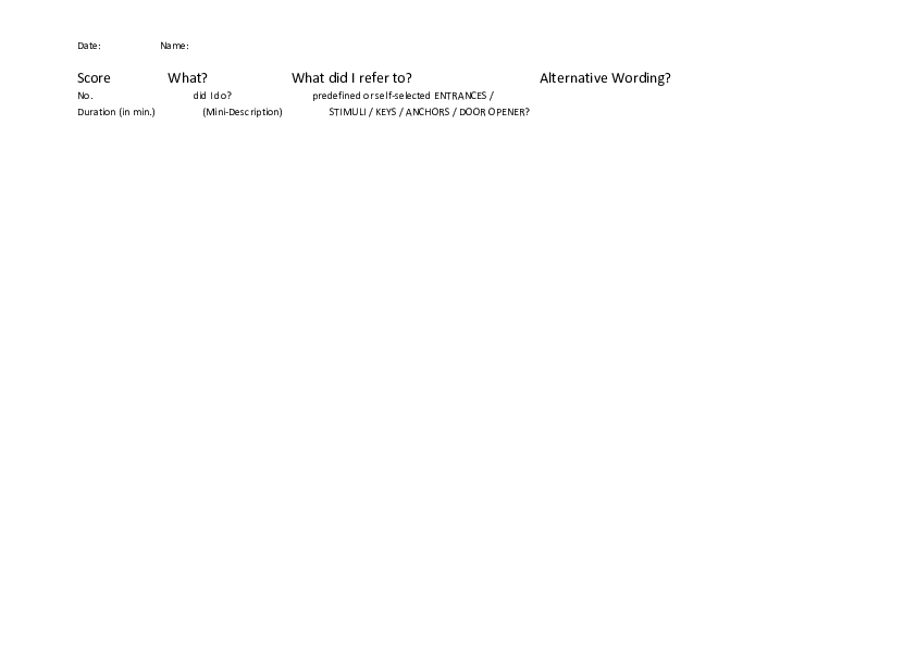 What is/are your question/s? Do you plan your documentation or do you leave it to the moment? Where/when do you notice? What triggers a change? What catches your attention? What touches you? How? What occurs (state/encounter/movement...)? What is significant? What have you missed/passed over? What could be a next step? |