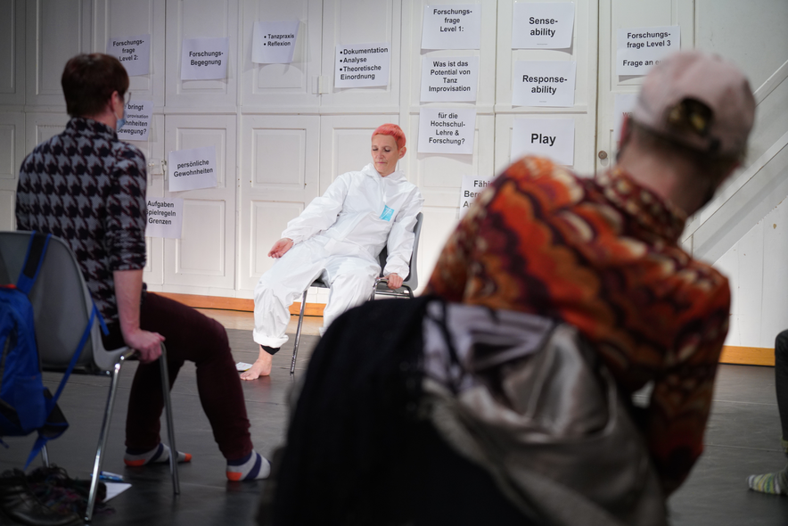 According to performance studies theorist Lucia Rainer, lecture performances “provide a space to exhibit and (re)negotiate the coalition between art and academia” (Rainer 2017: 15). They are “situated between lecture and performance without entirely being one or the other” (Rainer 2017: 196). They do not “first and foremost – inform an audience, discuss a topic, and disseminate knowledge. Instead, they link to making knowing practical through documentary, interventionist, and research-based approaches” (Rainer 2017: 197). In my case this means: These lecture performances were not a dissemination of results at the end of my research. They aimed to make dance improvisation accessible and understandable to the participants and to provide an exemplary experience of dance improvisation. They also aimed to make room for the participants to share their thoughts and perspectives on this experience and to share their personal ideas on my general research question during that time, which was: What is the potential of dance improvisation for science and engineering students and researchers?