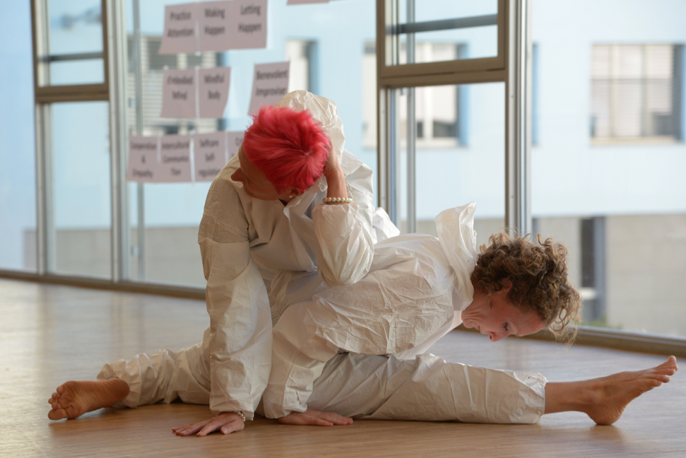 As I am an experienced dance improviser myself, the question arose as to how far my own dancing might transport and illuminate the learning potential of dance improvisation. In my previous artistic research, my own body and dancing had been a central element of my research process and performative outcomes.[1] That past project, though, revolved around questions of practices and the staging of ageing bodies in the field of professional contemporary dance making. Therefore, my own dancing body and my own choreographic representations of age and ageing made up a fertile research ground for “rethinking age(ing) in and through improvisation practice and performance” (Martin 2017). Within ASCOPET, however, the interest is not in the meaning of artists’ bodies on stage, but the meaning of engaging scientists’ bodies in improvisation practice. Within this, the experience of partner and group improvisations as collective creative acts are important. Therefore, even though this practice aims at performing and the journey of preparing and making a performance together is at the core of its particular learning potential, it is not through the watching of an improvisation performance per se that its potential for scientists can be understood, but rather in the embodied process of doing it. Consequently, although I did explore different options for integrating my own dancing into the performance, I mainly took the role of facilitator and moderator and kept most events concentrated on shared practical experiences.