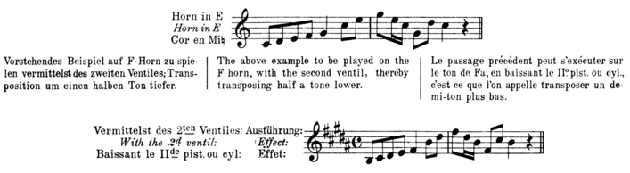 ‘It cannot be denied that the tone in certain passages will sound better when executed in the original pitch, [...] the tone of the E flat and C horn sounds fuller than in F. However, as long as a passage is executed perfectly, little notice will be taken whether or not it has been transposed.’