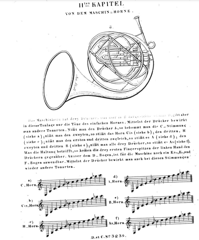 Andreas Nemetz has possibly the first treatise which mentions the Maschin-Horn. Although there is no written information about what he or other contemporaries thought about the instrument, and there is not too much information how people really used it, we can still seek out a bit of interesting knowledge which enlightens us about the use of the instrument in 1829. One of these is the fact that they already used the three valved version according to the pictures, they possibly used the valves as a crooking device: ‘...One can control other tonalities with the use of the valves. If one takes the 1st valve, then he gets in C…’; and the instrument still had crooks, which could change the ground tonality of the instrument. Beside the short explanation the book includes a fingering chart and a couple of small exercises.