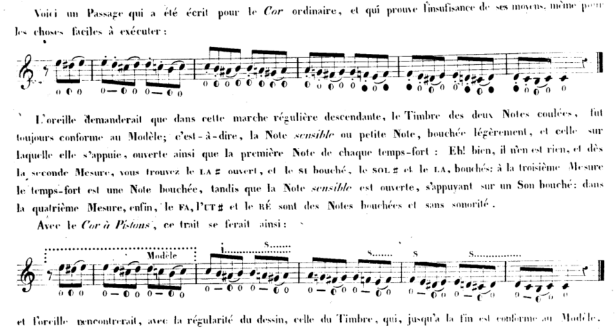 Joseph Meifred was a student of Louis Francois Dauprat, who is one of the three famous hand horn teachers from the Paris Conservatoire. He published the Méthode pour le Cor Chromatique ou á Pistons in 1840. The main difference, that one can notice, between this work and the German tutors, like the one from Andreas Nemetz, is that he used the horn with two valves. That means that he did not want to completely avoid the hand technique, and the different sound colours, and characters that can be produced by the hand stopping. We can also see in the exercises, that he does not mark the fingering for each note, but a mixture of the two valves, ‘i’ for inferior (half step), and ‘S’ for superior (whole step), and the degree how much the bell scold be covered by the hand. As it seems, he tries to not close the bell completely, but finds it important to use half stopping. He also mentions it among the five disciplines what he finds important when one performs on the new horn:
