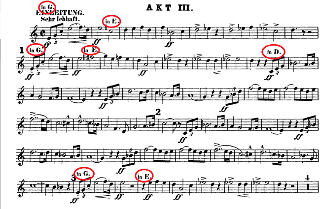 In the chapter ‘Practical Hints to the Orchestral Artist’, beside a lot of useful advice, he gives special attention to the transposition. As the valve horn started to be the common instrument, the musicians also started to change the crooks less frequently, and the F crook became the general tune for horn, since this key is in the middle of all the tunings (from Bb basso to C alto)and on this one is it the most possible to have an overall good sound and playability. This absolutely understandable trend also caused many hornists to assert that the use of the crooks in connection with the Ventilhorn should be discontinued [...] since everything could be transposed on the F-horn [...] I advise the employment of the G, the A , and the high Bb crooks whenever these are indicated by the composer.8