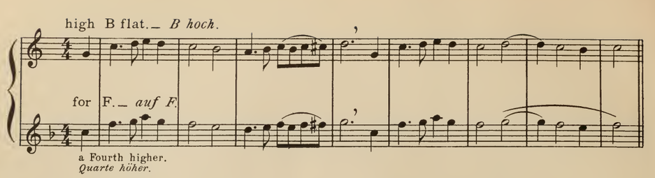 ‘As the tone of the higher-pitched Horns invariably sounds brighter and clearer, the following examples should be played in the original pitch.’