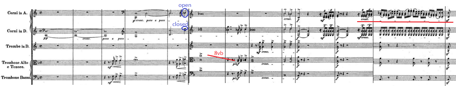 The most prominent is which instrument was used in which movement. In the original version, the first pair of horns played in all the movements and did the change from the F-crook to D-crook, then to the A-crook for the last movement, while the second pair of horns play only on the D-crook, and do not play in the two middle movements. In contrast to this, in the revised version, the Ventilhorns have tacet in the Romanza and they play only at a few places in the Scherzo, where the natural horns can’t play audible. Why did he do so? We can see that he did not really ask the valve horn players to change their main tuning of the pieces, and as I see, he also prefers the natural horn in the music which is softer, and more intimate, because its sound fits better in this type of music. He recognised that the valves and those tuning slides increase the weight of the body of the horn which causes a heavier, and stronger sound, thus he let the natural horns play at the spots where its sound is closer to the musical texture.