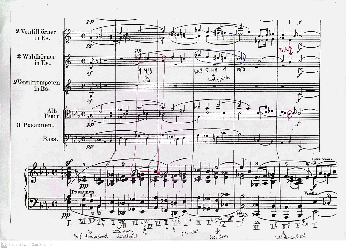 Three horns and three trombones play in the excerpt, but it is more a choral for four voices. The bass trombone plays the bass, the second trombone the tenor, the second valve horn the alto part, and the first trombone and the first valve horn supports each other in the soprano. The sixth instrument, the first natural horn does not have any independent voice, except its first three notes. Mainly, it supports one of the other parts, highlights the modulations, or brings the attention to one specific line which is shared between more voices. Beside supporting one of the other parts, Schumann also plays with one of the most exciting skills of the natural horn, which does not come out too often in the orchestral parts, rather in the solo repertoire, but here he uses this to make the harmony changes more interesting. This is the chromatic playing, where every note has a different character and it makes the music livelier, and adds extra emotions to it.