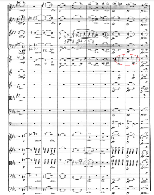 Fourth and fifth bar: here we can find a descending line Cb’-B’-A’-Ab’. The first two notes are played by the soprano voices, and the last two by the alto, except the third horn, which plays as it is, and makes a beautiful atmosphere with the different characters.