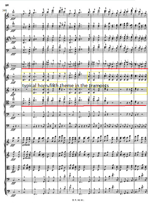 From this part it is visible that the horn section has got the possibility to integrate more in the brass section, even if it sounds strange, and use it to its full potential. It became possible to use it in excerpts like the discussed one, or the Fourth movement in the Requiem für Mignon op.98b, the Langsam from the IV. Symphony,or the end of the Genoveva Overture, from bar 348 there is a huge orchestral tutti where except the trumpets and the natural horns all the brass instruments have melodic material.