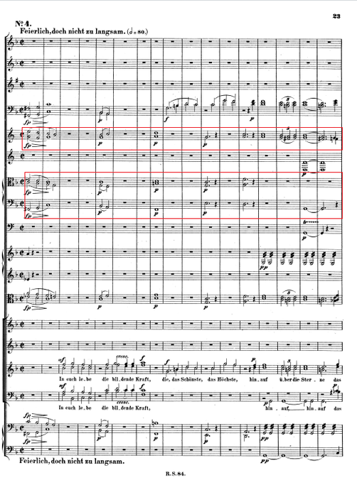 From this time, Schumann often used the two sections together, and not in the same way as we see in the Schubert symphony, but they played the same notes, the same melody etc. The importance of this is the fact that it became possible to use the horns better in passages like the beginning of the IV. movement of the Rheinisch Sinfonie; which we can take as a predecessor of the famous chorales for brass by Gustav Mahler or Anton Bruckner. Even though these examples, like the choral in the 5th movement in the 2nd Symphony, have a different character, they are also similar to this ‘original’ idea.