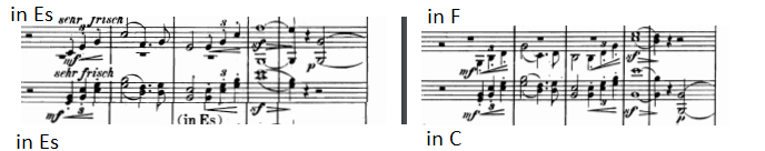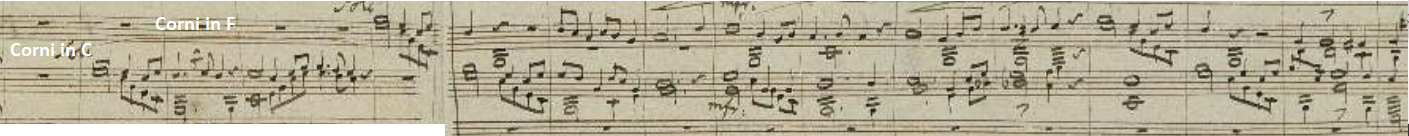 To be in the same tonality and have an open sound was not the only reason why Schumann let transpose a lot of the natural horns. As we know, the different tuned horns also have slightly different sound, and different character. The high horns have a brighter and shinier sound, in contrast, the low horns have a rounder, warmer, and darker sound. The classical composers made use of this diversity, and also the romantic composers did so. Like in the second movement of the Rheinisch Symphony, the horns in C are playing the echo; or we can make a parallel between the waves of the Rhein and the horns, the first wave/horn is more visible, and there is always the next, but it melts into the one before it.