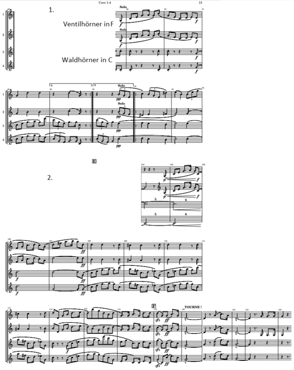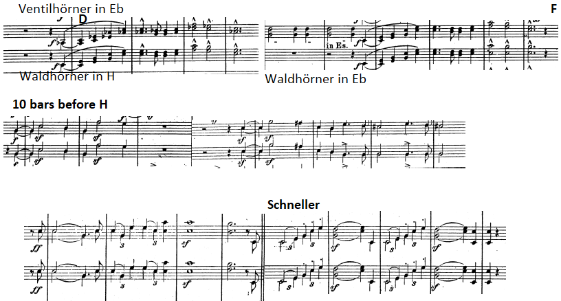 We can also see that he asks the valve horns to change the crook. As Henri Kling, and Oscar Franz said too, it is possible to hide the difference between the crooks with a couple of half notes difference, but it is noticeable if the difference is a fourth or even bigger. Therefore I would recommend choosing more carefully between the F and Bb horn. Since the horn players used the Eb,E, and F crooks the most on the valve horn in this time, it was exceptional, if the composer asked for the C, or even for the D crook. In my opinion, we should make a difference too. Of course, it is possible to play with more open mouth, or give faster or slower air, but this makes this change also easier. If one plays the the two solis from the Genoveva Overture, only because of the different tonality there will be a difference between the two excerpts, but if we take the shorter Bb horn for the first one, and the longer F horn for the second one, than also the feeling for us, but also the result will be much more audible, and more interesting. The composer also wanted to hear a difference, otherwise he could have just taken the open valve horns and let everything play on the same crook.