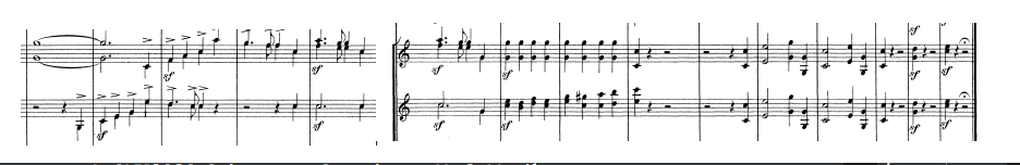 It was rare in the classical era that the composers used more than two horns in their composition. Of course, there are examples, like the ‘Hornsignal’ Symphony by Joseph Haydn, or Beethoven’s ‘Eroica’ Symphony. In this case, there were mainly two options for how the composer used the horn section(s). Whether they put all of them in the same key and used them both as one big section, for example, for solis, or the two pairs changed each other; or there were two pairs of differently crooked horns. In this example, they played mostly in different moments, which made it possible that the instrument was present through the entire piece. At the turning point between the classicism and romanticism, it became more regular to use four horns, especially in opera music, like in the Freischütz from Carl Maria von Weber. The two earlier methods were still used, but the composers started to use the two pairs more often together at the same time, even though they were differently crooked. One example is the already mentioned place from the 1st Symphony of Schumann, but I could show the most famous excerpt in this writing style, the beginning of the Overture to the Freischütz. Weber mixed perfectly the two differently pitched horn pairs. In measure 16, it sounds like a typical horn fifth passage between the first and second horn, but it is impossible, because the lower voice would be inaudible on the F-crook. So, Weber also solved the problem in another way. The first horn plays the upper voice, and the third horn, which is tuned a fourth lower, takes over the second voice. Also, the chords can be built up perfectly if one of the horns plays the third, which has to stop for that note. The end of the same excerpt is like this. The first horn in C plays the melody in the last three bars, while in the last two chords, first the first, then the second horn in F has the third of the chord. Both of them have to be played stopped on the F-crook, therefore it makes a perfect balance, that the third that should always be the quietest one in a chord is naturally a soft and hidden note.