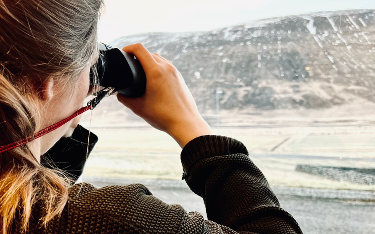 Out There was a performance in Kaffi Hólar, a restaurant and the touristic reception of Hólar, a small university village in the north of Iceland with importance to Iceland’s religious history.5 The audience was facing big windows in the restaurant, overlooking the fields and mountains around Hólar. I invited the audience to look out, to follow the movement of the fog over the frozen fields, to see how the fog sometimes covered the mountain, while sometimes the mountain would claim appearance again. I had brought two binoculars to share around, using them carefully as extension of their own eyes, to zoom in and out through the misty surroundings. I invited them to ‘look at what’s out there’.