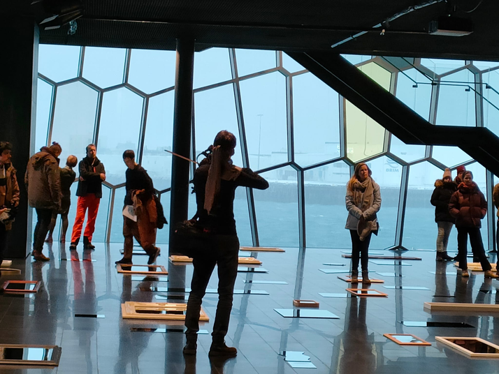Multi-Space was an installation in Flói, a large open area in Harpa, Reykjavík’s most prominent cultural center in the heart of the city.1 Designed by renowned artist Ólafur Eliasson and architect Henning Larsen, Harpa’s façade consists of overlaying geometrical constructions of steel and glass (reflecting natural light during the day, and constantly changing color during the night), while the ceiling of the large hallway inside is completely made of mirrors. As a counterpart to this ceiling, Multi-Space resembled a sea of mirrors to walk through, visually connected by glass walls to the actual sea and harbor outside.